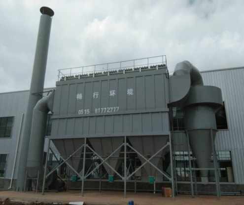 滤袋通过袋笼固定在花孔板上,每排滤袋上部都装有一根喷射管,喷射管上有小喷孔,并与每条除尘滤袋中心相对应。喷射管前装有与空气压缩机相连的脉冲阀,电磁脉冲阀与气缸相连接。控制器定期发出短程的脉冲信号,通过控制阀有序地控制各脉冲阀开启。工作时,含尘废气由进风口经中箱体下部进入各单元灰斗,大颗粒粉尘由于惯性碰撞、自然沉降等作用直接落入灰斗、其余粉尘随气流进入中箱体过滤区,粉尘积附在滤袋外表面,过滤后的洁净气体透过滤袋经上箱体、排风管排出,从而达到除尘的目的。当滤袋表面附积的粉尘达到一定量时,清灰控制装置发出清灰信号,通过控制阀有序地控制各脉冲阀开启。当脉冲阀开启时,高压空气从喷射孔中以极高的速度喷出,进入滤袋内,使滤袋剧烈膨胀,引起冲击振动。同时在瞬间内,产生由内向外的逆向气流,使粘在滤袋外表面及吸入滤袋内部的粉尘吹扫下来。吹扫下来的粉尘落入集灰斗内,最后经卸料器排出。各排滤袋依次轮流清灰,待一周期后,又重新开始轮流。